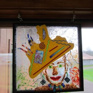 To enhance Girl With Cow, decorations of bright dichroic and fused art glass as well as “millefiori flowers” are added. The shiny glittering embellishments of dichroic glass, change color with the lighting and come to life. Pieces of glass, frit, give dimension to the the pasture in the background.