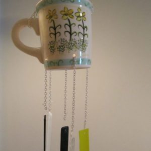 White Flowers on Blue Wind Chime has its delicate sound from attached fused glass chimes.The chimes have been fused in the kiln to smooth and strengthen them and are then attached, through a drilled hole, with silver plated chain to the ceramic. The glass chime colors are specifically picked to match those on the cup.The fishing line at the junction with the chime allows for the vibration which creates the sound.